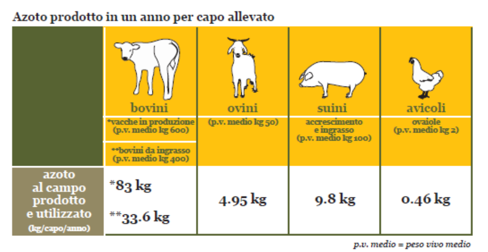 Con l’entrata in vigore del regolamento 18354 del novembre 2009, è stato definito che l’autorità competente che ha il compito di definire il numero massimo di animali adulti equivalenti a 170 chilogrammi di azoto per ettaro per anno, utilizzando la tabella sopra riportata a titolo orientativo, è la Regione o la Provincia autonoma territorialmente competente. Le tabelle predisposte dalle Regioni o Provincie autonome vengono quindi trasmesse al Mipaaf.