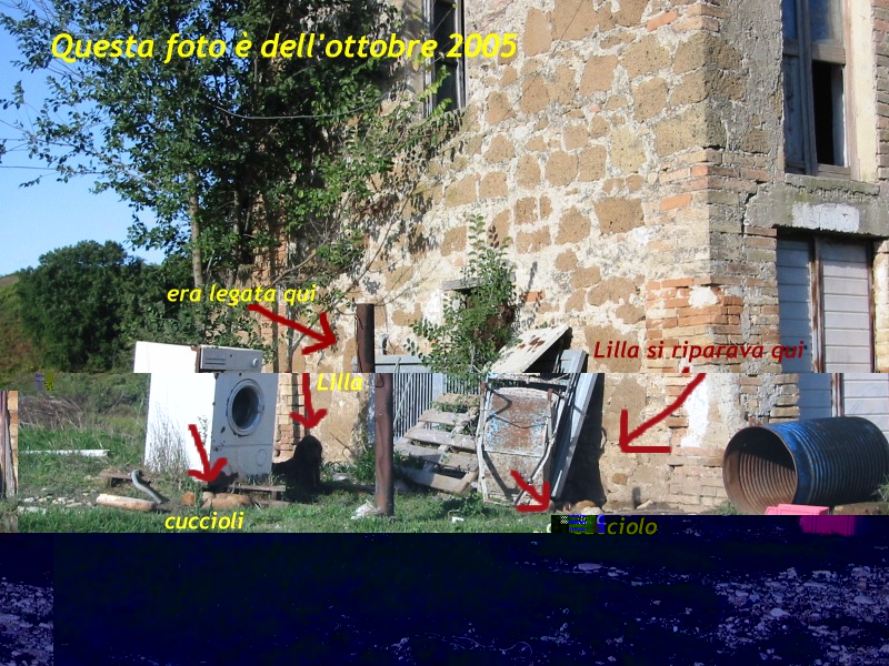 Mario e Tenerona, grazie per quello che mi dite. Non mi alleviano le vostre parole... purtroppo. Ancora soffro tanto per i maltrattamenti agli animali, qualsiasi essi siano e cerco di reagire e di contrastare questo dispiacere ogni giorno perchè ne vedo e ne sento continuamente. Non so se un giorno diventerò coriacea o se il dolore mi farà uscire di testa e diventerò una barbona di città che parla da sola. Davanti a quel posto dove era legata Lilla ci passavo due volte al giorno e mi sentivo in colpa per una colpa che non avevo. Forse guardando la foto si può comprendere perchè mi sono promessa che non l'avrei legata mai più, lei che legata li' negli anni ha preso sole a 40 gradi, gelo, pioggia, si è accoppiata, ha sgravato, ha allattato, ha patito fame, sete, affetto, libertà, lei con quegli occhi dolci e profondamente tristi... Allegato: