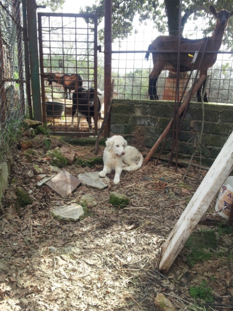 Se dorme o sta sdraiato molto è normale. E' molto stressato e quindi anche il comportamento non è quello che avrebbe un cucciolo di buon carattere quando arriva in una casa nuova. Poi non sappiamo la storia che ha avuto e come lo hanno trattato dove era prima. O è nato così disturbato o lo hanno fatto diventare così non sappiamo come, magari non ha mai visto esseri umani oltre a chi gli buttava un pò di pappa, o non ha mai ricevuto carezze o neanche un richiamo in modo dolce. In fondo ha novanta giorni di vita, dovrebbe almeno essere un minimo socievole con l'uomo, anche se è normale che sia un pò impaurito da te che non aveva mai visto prima. Dagli sette giorni, che è il tempo necessario al cucciolo per passare il trauma del cambio di vita e per mostrare la sua vera personalità. In una settimana devi vedere qualche miglioramento, tipo che ti si avvicina, resta in tua presenza senza ritrarsi o ringhiare o è soltanto più sereno, cammina tranquillo per la stalla e accetta capre e nuova casa. Se non cambia o peggiora... con la morte nel cuore devi riportarlo al padrone. Ora è un simpatico batuffolotto, tra un anno o due se rimane così aggressivo e inibito può diventare un'arma letale per tutti compreso te.