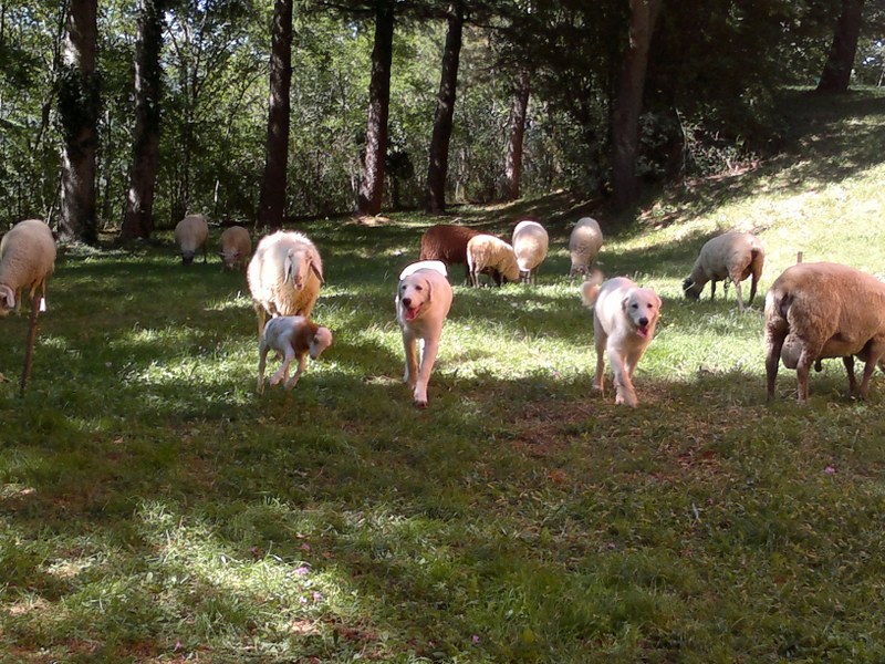 I nostri cani bianchi hanno 10 mesi, non abbiamo più parole per descrivere le loro doti. Sono praticamente perfette, ora vivono libere per l'azienda e controllano l'intero territorio, fino a dove sanno essere loro proprietà. Sono affettuosissime con noi di famiglia, gentili di modi ed educate con gli ospiti, un pò invadenti con chi gioca con loro... quando ti arrivano addosso con i loro abbondanti 90 kg in due apriti cielo... con il gregge sono pazienti e sottomesse e con gli altri animali di casa sempre rispettose. Con gli estranei si dividono i compiti: Rosa è più timida e schiva quindi quando c'è gente è Berta che si avvicina e abbaia alle persone e Rosa rimane nel gregge o attorno a casa. Al momento del cibo è la timida Rosa che comanda... e la coraggiosa Berta sta al suo posto. Se c'è un vero pericolo, o ci sono selvatici vicino ai recinti, o sentono un odore particolare, tutte e due assieme partono come missili abbaiando verso il pericolo. Cani speciali, veramente. Ora che li ho come amici e compagni di lavoro posso dire che il meglio del maremmano abruzzese lo si ha se gli si permette di vivere libero e senza recinzioni attorno, dandogli sempre fiducia e correggendolo solo se oltrepassa i suoi limiti, cosa che devo dire succede davvero raramente. Quanto sbaglia chi gestisce un canile e dà in adozione i cani bianchi solo a chi li tiene in appartamento  fanno il loro male a rinchiuderli in casa, li fanno impazzire di malinconia. Eccole durante il loro riposino pomeridiano