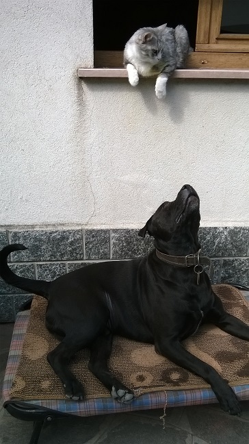 prima colazione io (e il gatto), poi gli altri quadrupedi  (mangiano meglio loro) per quanto riguarda l'ascendente labrador ci sarebbe anche il mantello: nero sulle punte e cioccolato sotto; gli ascendenti di un meticcio sono sempre ipotesi, il carattere è di un molosso tranquillo, equilibrato, senza paure, molto protettivo, istintivamente socievole con gli altri cani e, se attaccato, reagisce senza ferire, come fanno i cani "normali" (molto rumore, molti denti snudati, qualche spinta, qualche presa e poi amici), massiccio ma non tanto alto. Intanto continuo a documentarmi su cuccioli e cuccioloni e a guardare i nuovi arrivi del canile, se mi decido a questo passo sarà, probabilmente, nell'anno nuovo.