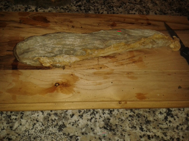 Ieri un mio amico macellaio mi ha portato 2 abomasi di agnello. me li ha portati già salati in superfice e mi ha detto di metterli ad essiccare. io li ho messi ad asciugare in un locale fresco ed asciutto non avendo una stanza adatta col camino. visti così a primo impatto non sembrano proprio di agnellino da latte, risultano abbastanza scuri e grandi per un lattante.
