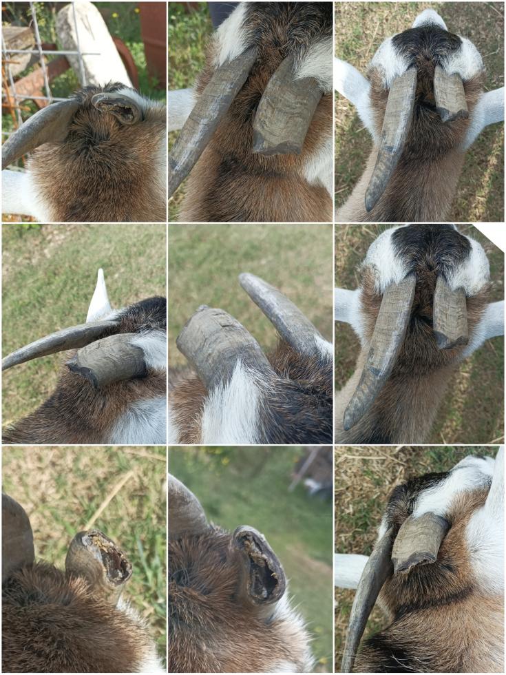 Buongiorno Ho due caprette, la mamma é leggermente più piccola della figlia e l'altro giorno le si é spezzato un corno, credo proprio per colpa delle botte con le corna più grandi della figlia. In estate si era formata una crepa da cui é uscito un pochino di sangue, ho disinfettato la ferita e si é rimarginata tutta ma nel tempo la frattura si é allargata fino a far cadere la metà superiore del corno. Lascio la foto in allegato. Vorrei sapere se devo fare qualcosa ora che si é rotto, dentro sembra secco nel senso che non é uscito sangue alla rottura e non sembra che alla capra faccia male. Qualsiasi consiglio é ben accetto, vorrei evitare qualsiasi malessere della capra, non so se la rottura delle corna é frequente oppure se sia un problema che stia con la figlia.