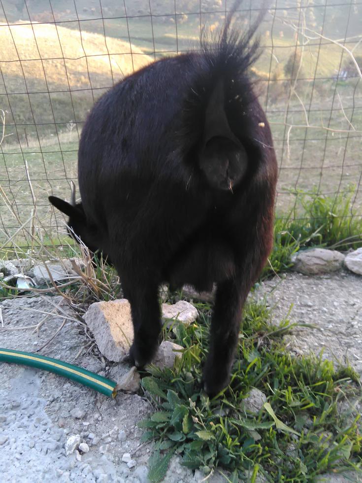 Per quanto riguarda la gravidanza, sarebbe perfetto se tu potessi fare una fotografia mettendoti proprio dietro la capra, centrata sul suo posteriore: così potremmo avere una migliore prospettiva su entrambe le parti della pancia dell'animale.
