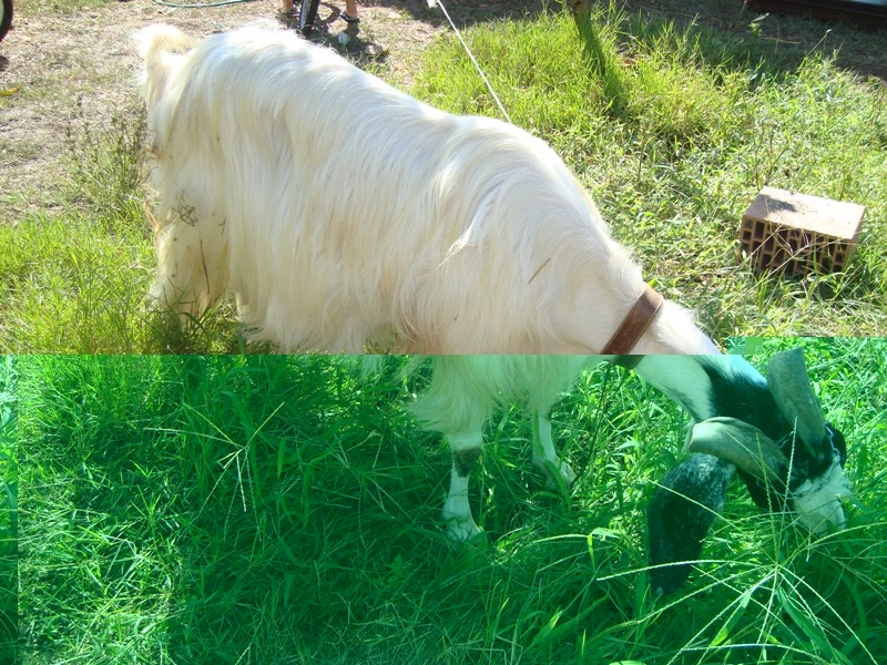 eccola mentre pulisce l' orto (si chiama sara ) ha 8 anni , è un po fuori standard ha la mammella pelosa ed è troppo alta 83 cm . Ma sono convinto che con buoni riproduttori posso migliorare a voi il giudizio