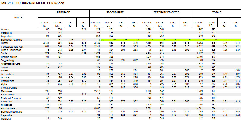 Sul sito dell'aia ho trovato questa interessante tabella riassuntiva delle produzione medie per razza nell'anno 2010. Potete trovarlo nel loro sito nella sezione "bollettini" ma siccome si vede solo con explorer e bisogna scaricare un activeX, per comodità ve lo riporto qui come immagine (sperando sia leggibile)