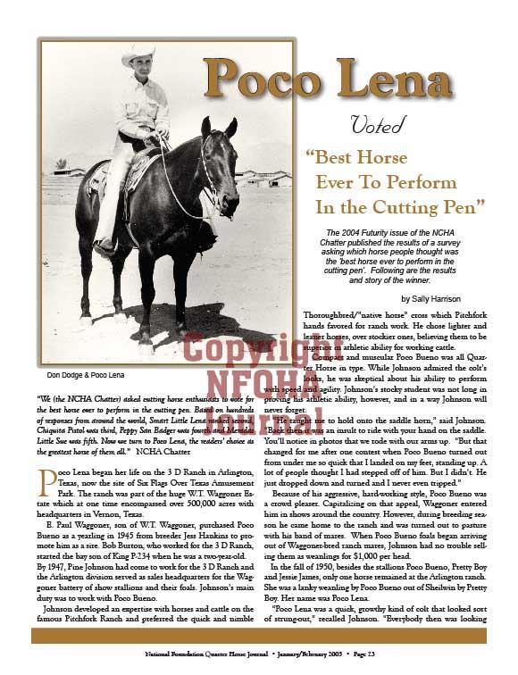 Don Dodge, doveva alzarsi spesso nel cuore della notte, quando l'arena era completamente libera, montava Poco Lena e la lasciava galoppare a piacimento. Lei partiva a mille, a briglia sciolta girava il più veloce possibile e continuava finchè non si scaricava completamente, al che rallentava poi si fermava con un bel sospiro.