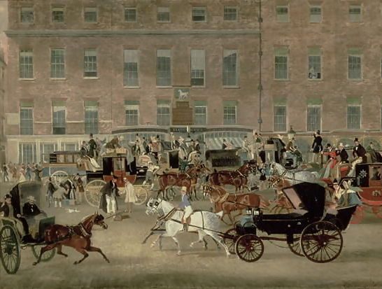 James Pollard _ Hatchetts - the White Horse Cellar, Piccadilly, the Devonport Mail and a Barouche in the Foreground.jpg