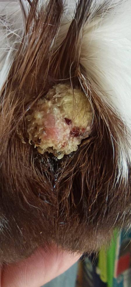 Buongiorno a tutti, scrivo qui poiché non saprei a chi rivolgermi, ho letto diversi articoli ma non sono riuscito a trovare qualcosa di simile a quanto successo ad uno dei miei porcellini d'india. Praticamente, come da foto allegata, ha la "codina" più pronunciata (non ha mai avuto problemi) e si sono formate delle crosticine. La foto è fatta in macro, sembra una cosa enorme, in realtà la dimensione dell'escrescenza è di circa 1cm. Ho da subito disinfettato l'area, ho usato sia un disinfettante non a base di alcool che acqua ossigenata, poi ho lavato la zona e messo aloe 99% in gel. Sembra che qualcosa si sia ridotto, ma permane questo enorme "brufolo". La parte gialla che si vede, le crosticine, sono secche, non si tratta di pus o parti molli. A qualcuno di voi è capitato di avere una situazione del genere? Aggiungo che Minù ha 4 anni e non dà segni di fastidio o prurito, non si gratta, mangia sempre volentieri, corre come sempre, gioca con il sul fratellino Bandito. Grazie, buona giornata a tutti.