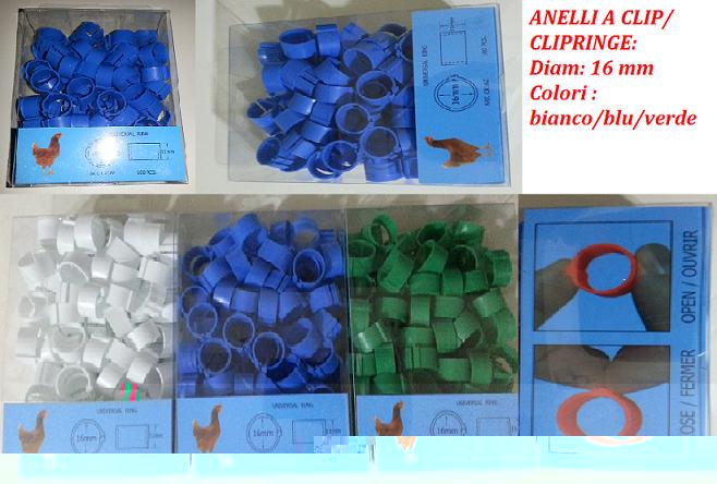 Salve a tutti, ho disponibilità di anelli clip ( CLIPRINGE), in 4 diametri 16/18/20/25 millimetri a seconda della razza avicola in questione. Sono disponibili nei seguenti colori: 16 mm : bianco - verde scuro - blu 18 mm: giallo - verde scuro - arancione 20 mm : blu - verde scuro - arancione 25 mm : evidenziato - bianco - blu Utilissimi per una rapida identificazione tra i vari soggetti, per una facile suddivisione tra soggetti della stessa razza in modo da non confondere le diverse linee di sangue. Facilissimi da applicare. Per qualsiasi info contattatemi in MP. Saluti Luca.