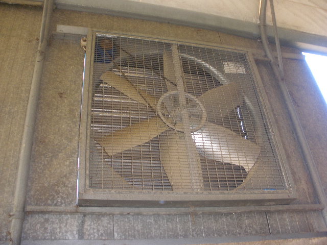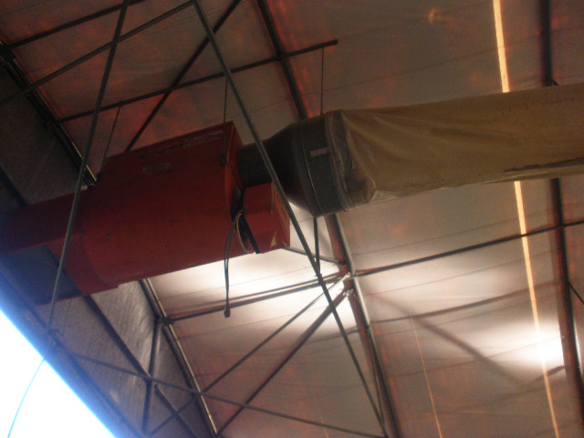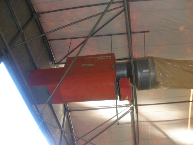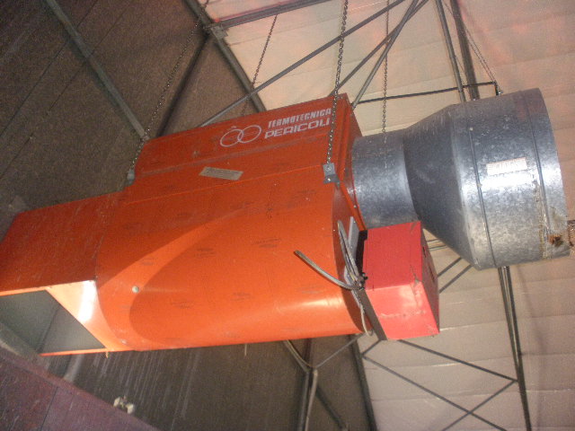 Sistema di riscaldamento a gasolio con immissione di acqua per umidificare ambiente, composto da 4 bruciatori Termotecnica Pericoli e sei ventole estrattive per il riciclo dell'aria. Mai usate.