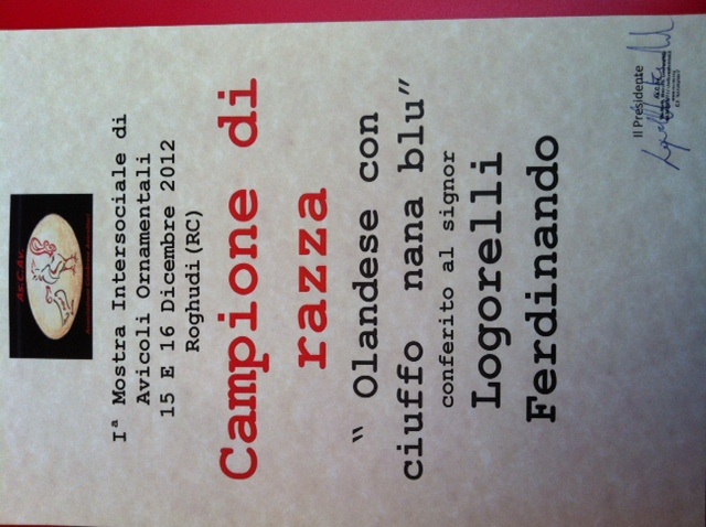 A partire dalla prossima settimana comincerò a cedere uova feconde di Olandese ciuffata nana nera e blu a ciuffo bianco. Il gruppo è composto da 6 galline e due galli. Quest'anno ho vinto due diverse mostre a giudizio con tre esemplari . Ecco alcune foto.