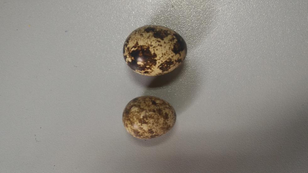 Per chi fosse interessato da poco anche la mia quaglia cinese ha iniziato a deporre, la mutazione del maschio è ancestrale mentre quella della femmina è Red breasted. Nella foto si vedono un uovo di quaglia da carne, un uovo di quaglia da volo al centro è un uovo di quaglia cinese.