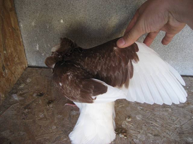 ciao che belli ,bell'idea quella di spostare le foto dei nostri colombi ,però se dovessi mettere tutti quelli che ho riempirei 10 pagine  per ora metto una foto di un novello di capuccino olandese nato da due genitori pezzati però lui è nato di questo colore come mai e che colorazione può essere ??non mi sembra pezzato ma solo sfumato di bianco mi interessava sapere se è da scartare  vi metto le foto dei genitori che risale a questa primavera perchè non ne ho fatte di nuove