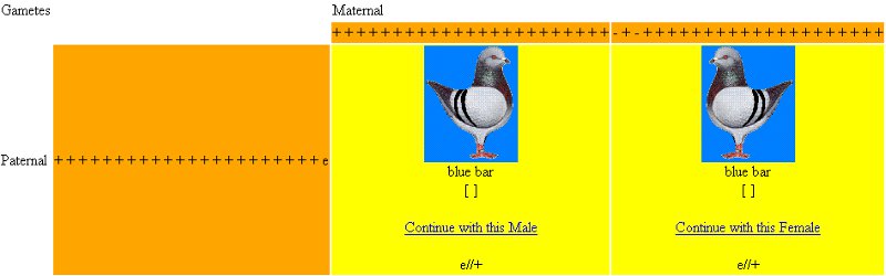 se ora incrocio 2 figli tra loro, cioè eE X eE otterrò una certa percentuale di rossi recessivi, cioè quando le due e (minuscole) di entrambi i genitori si incontrano otterrò dei colombi ee che mostrano nel fenotipo questo carattere... più precisamente il 25% dei figli nati da due colombi blu, entrambi portatori di rosso recessivo, saranno rossi recessivi.