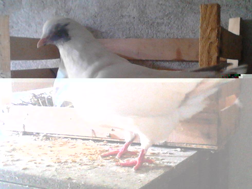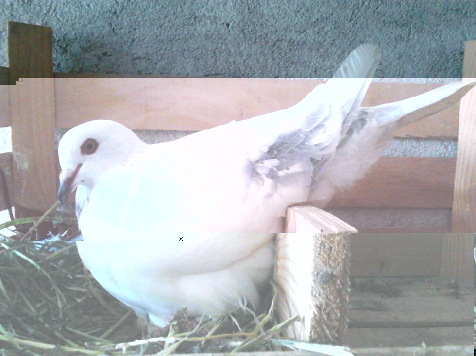Mentre questi bianchi dei texani,purtroppo la femmina a si trova nel nido ,ma vi invio lo stesso la foto.vi informo che che la femmina e tutta bianca con qualche spruzzetto scuro sul collo,ma macchia geiggia tra la punta dell'ala e la coda e vernice che ha usato il venditore per segnarla.