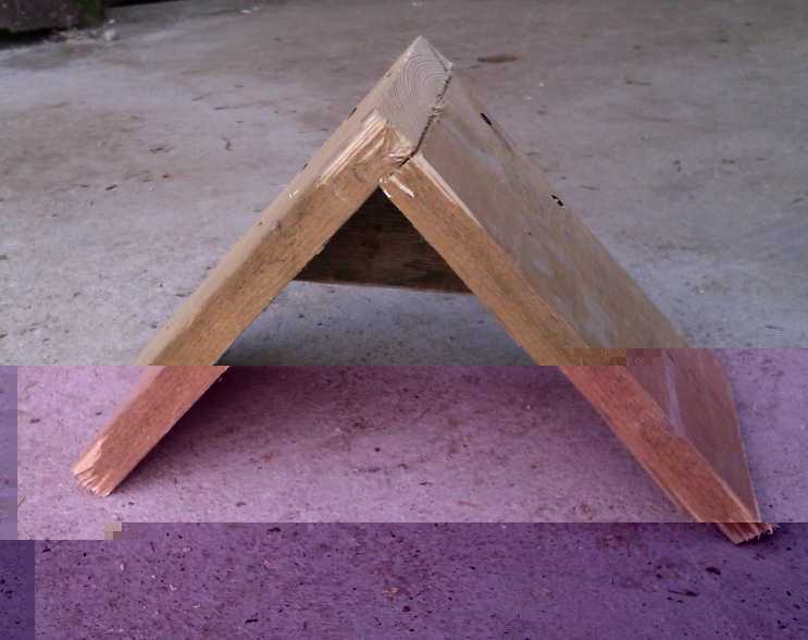 Il "triangolo" l ho tagliato con un inclinazione di 45 gradi circa su entrambe i lati,le tavole l ho tagliate a circa 25cm sul lato corto,e sull altro lato 25cm+lo spessore della tavola su cui va a poggiare (ad es 2 cm).