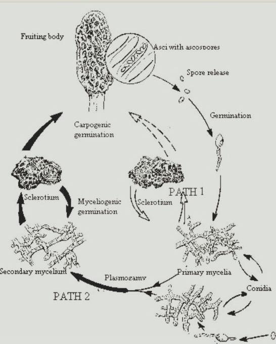 Faccio un breve intervento Il genere morchella è un fungo saprophytic saprofita sotto allego un disegno del 1989 fatto dal più grande esperto mondiale T Volk per capire il ciclo in modo semplice , che manifesti situazioni con micorrize non ho letto ancora studi scientifici al riguardo ma ho rivolto la domanda ha un grande esperto per avere risposte più dettagliate, che cresca vicino ad un determinato albero non vuol dire che micorriza con lui ....( forse c'è un determinato microbo che lo aiuta a innescare la crescita dello sclerotia!? ) La morchella esculenta che cresce nel suo terreno è realmente una esculenta !? c'è una grande studio al riguardo in usa e Cina per fare chiarezza , sono arrivati a contarne 80 specie differenti se non erro ,l'ultima il micologo Kuo ne ha scoperta una , ho letto dibattiti di micologi americani ed ho capito che c'è molta confusione per la classificazione, In lingua italiana non esiste nulla al riguardo in Cina c'è una scuola specializata per la formazione di personale per la coltivazione della Morchella Allego delle mie sperimentazione , con crescita del micelio Esculenta in vaso ...a presto !!