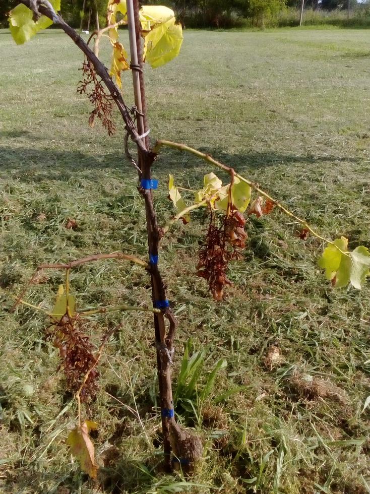 Scusate il ritardo della mia risposta, ma stress idrico mi pare esagerato. Nella realtà le due barbatelle le irrigavo una volta la settimana con parecchia acqua essendo il terreno franco-sabbioso. Purtroppo non potendo essere presente costantemente non so dirvi se è stata una cosa lenta o repentina, ma nell'arco di 2/3 di settimane le viti sono passate da avere dei bei grappoli formati con degli acini molto belli a quello che vedete in foto. Forse è come suggerite voi, l'acqua data una volta alla settimana non è bastata. Vediamo cosa mi riserva l'annoi prossimo. Per ora grazie delle vostre suggerimenti.