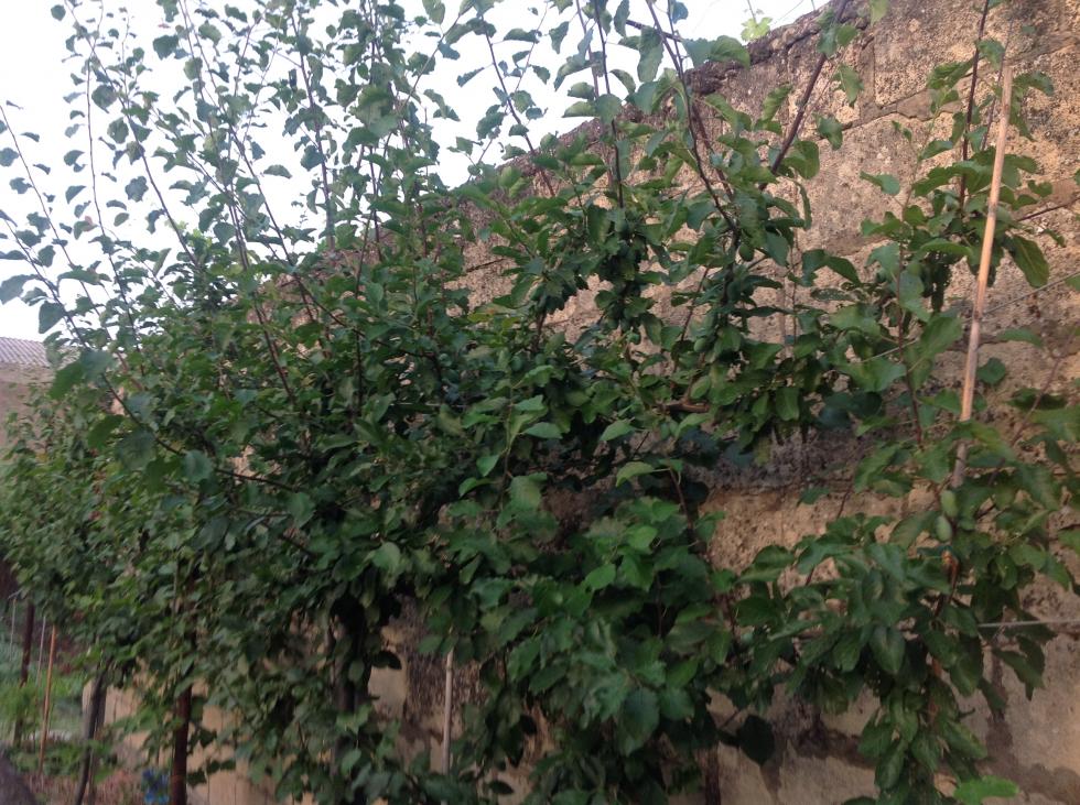 1) Sugli alberi della prima foto non saprei darti suggerimenti: ho avuto per anni degli alberi da frutto messi in una posizione simile, anche più distanti dal muro, e non ci ho mai prodotto niente di buono. Tra l'altro sarebbe interessante capire l'esposizione, perchè quei rami alti sembrano andare a cercare il sole molto in alto, come se la parete fosse esposta a nord.