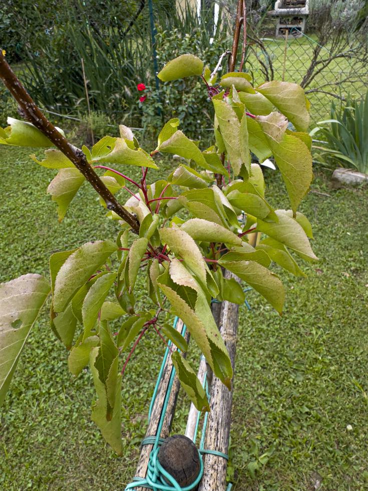 Salve a tutti, nel mio piccolo orto ho piantato una pianta di albicocco Var. Reale d'Imola su mirabolano che adesso mostra segni di crisi visibili dalle foto delle foglie allegate. Ho trattato con olio di Neem senza risultato, ho pprovato con Decis senza risultato. Qualcuno può aiutarmi? Grazie