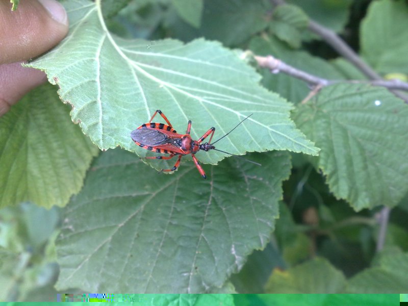 è una Rhynocoris iracundus anche detta cimice assassina, è predatrice di altri insetti quindi un insetto utile, ha un apparato boccale pungente-succhiante detto rostro, se disturbata può pungere anche l'uomo!