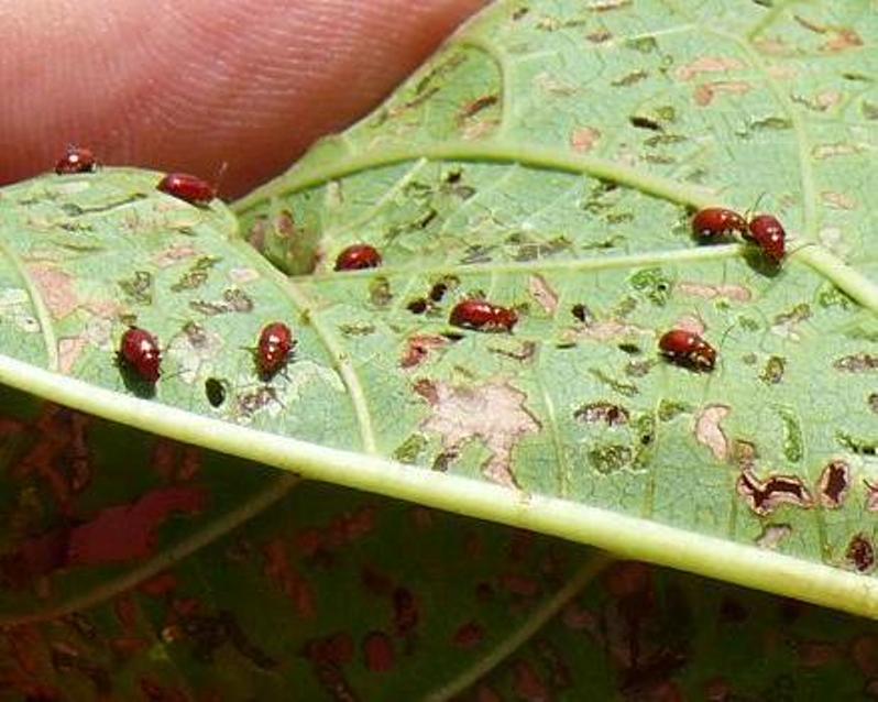 nn è un ragnetto sembrerebbe un'altica ci vorrebbe una foto macro per cercare di capire la specie cmq è difficile combatterlo senza chimica xchè credo sia anche polifago