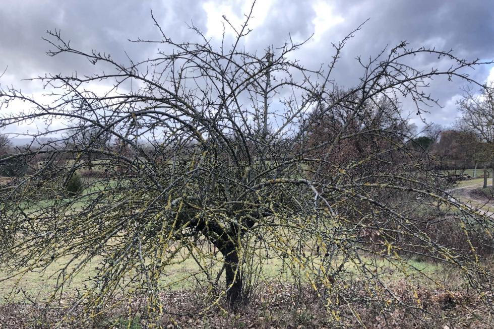 Inizia col togliere quei rami che vanno verso terra pieni di licheni e magari vuotare un po' l'interno della pianta in modo da aumentare la luce. Negli anni dovresti portarla a vaso aperto con rami ricadenti a 45°.