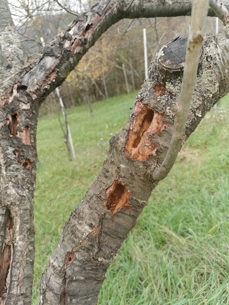 Non direi. Il legno del primo susino (prima foto) è più bianco e tende a sfaldarsi. Quello del secondo è più consistente anche se all'apparenza sembra molto rovinato; le cause dei danni mi sembrano diverse tra i due. Non ho mai visto dei picchi nella zona, ma ci sono gazze e cornacchie ; potrebbero essere loro la causa?