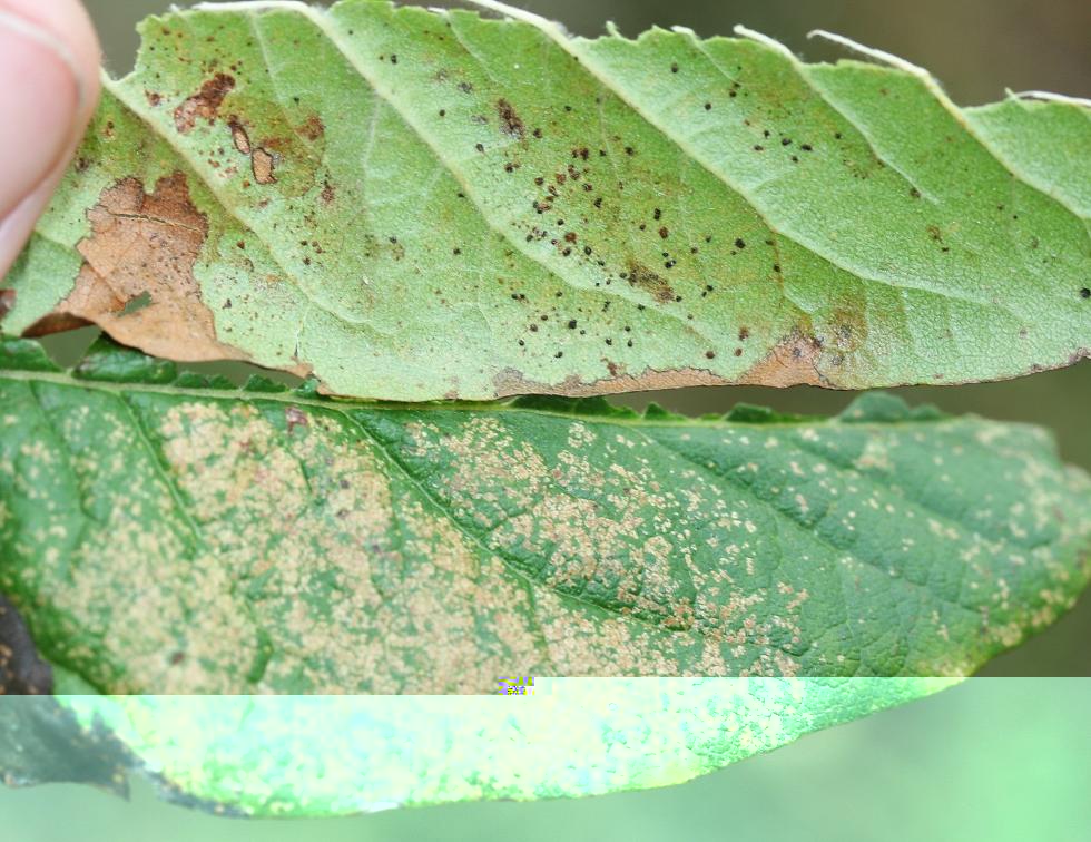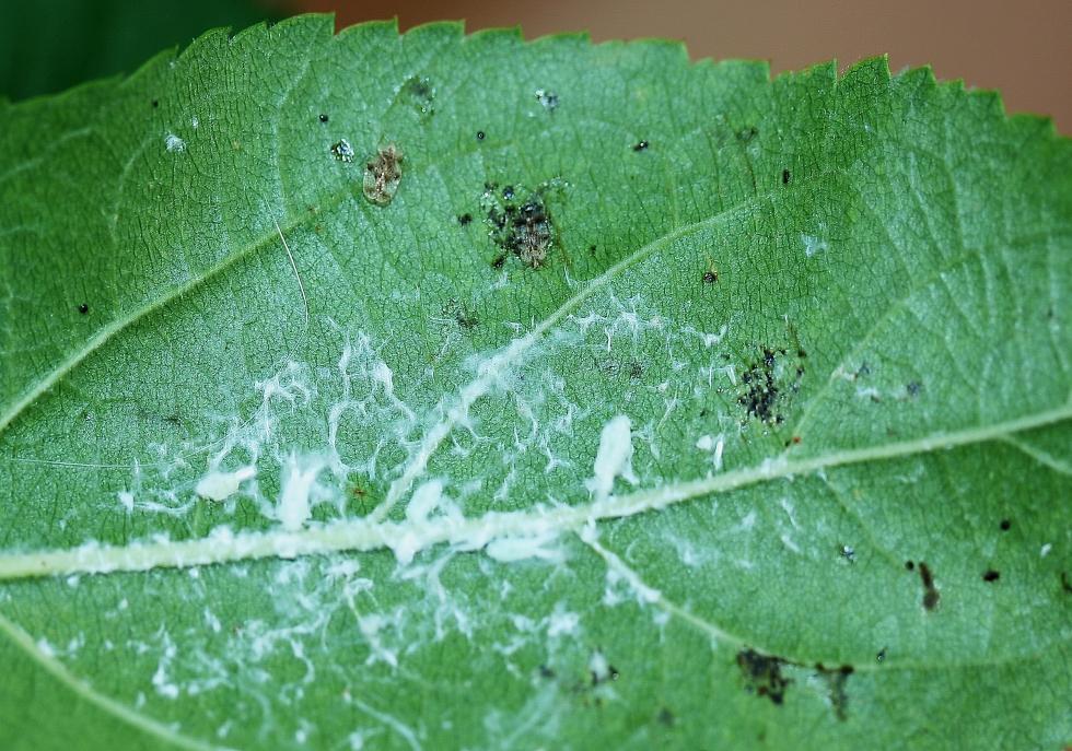 Dici che non hai visto acari, dunque presumo tu abbia osservato, meglio se con occhio armato di lente, il retro delle foglie che però dalle immagini postate a noi non è dato visionare: ora in particolare nella fg. in alto a sx mi sembra di scorgere come una puntinatura, perciò sarebbe utile ricontrollare. Io ti posso solo dire che, nella mia zona almeno, ho veduto quest'anno molta presenza di tingide, ma sono insetti che stanno appunto sul verso della foglia: adesso ormai non ci sono più forme attive ma rimangono le loro imbrattature e appunto il tipico esito sul dorso della foglia attaccata (ti allego una foto che ho scattato in questi giorni su un nespolo comune, e una seconda su un mio melo ornamentale fatta a giugno dove oltre due adulti di tingide - sono quelli piatti in alto - ci sono cerosità candide e forme giovanili di metcalfa anch'esse bianche). La lanuggine di cui parli dalle foto non riesco ad apprezzarla, perciò non ti so dire se è mal bianco.