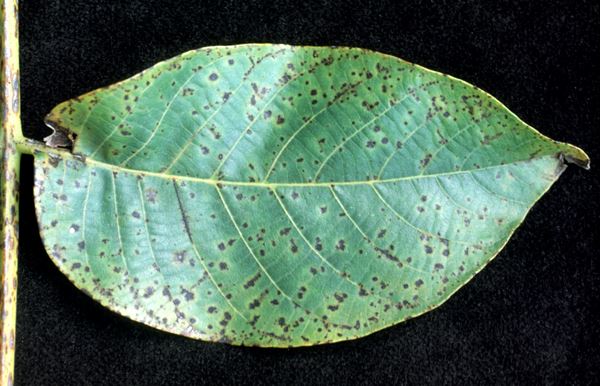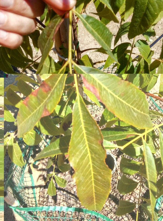 Leggo infatti che "symptoms included tan to light brown necrotic lesions, which often started on the leaf margin and expanded throughout the leaflet, eventually resulting in abscission. Some leaflets exhibited tip necrosis with the end of the leaflet curling upward"; poi si ha defogliazione anche grave e riduzione delle produzione (avrai certamente veduto foto ma ne metto una a beneficio di chi legge: nella dida originale è scritto "sintomi iniziali").