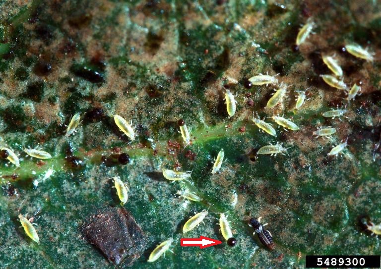 La foto attraverso la lente (ma anche la precedente) permette di dire che si tratta di tripidi (le forme bianche sono neanidi, cioè le forme giovanili non alate; le forme nere per associazione deduttiva dovrebbero essere gli adulti).
