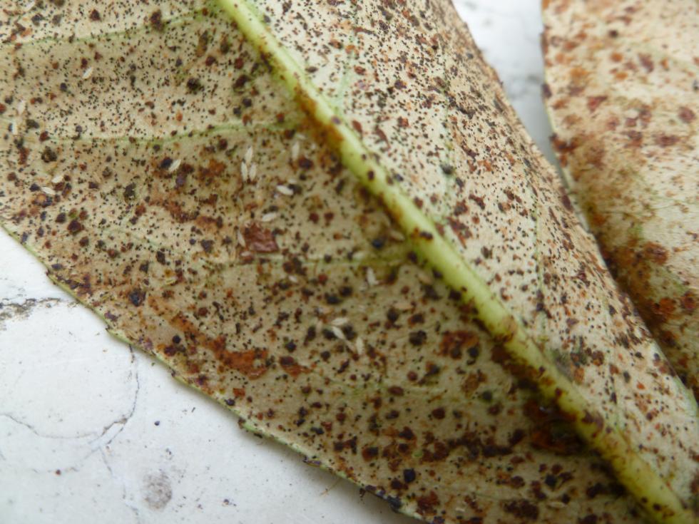 o pulviscolo che si è formato sulle foglie NON è biancastro come l'oidio ma un marrone-rossastro. Inoltre se le foglie vengono bagnate