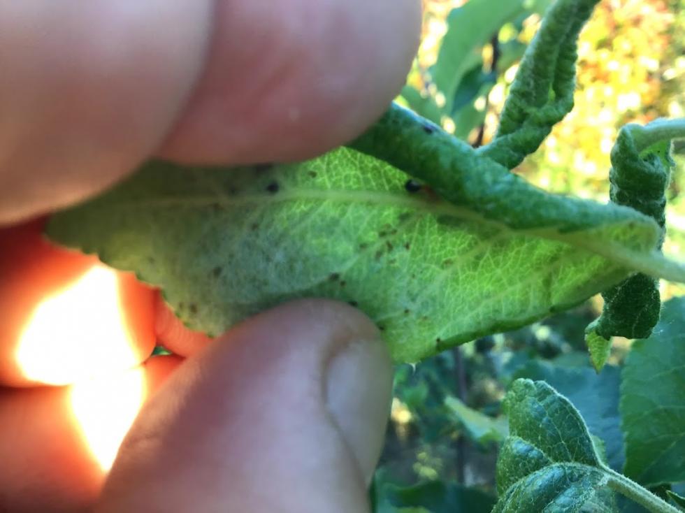 Pero: Albero giovane circa tre anni: buona presenza di piccoli frutti, foglie un po accartocciate e presenza in alcune foglie insetti/ larve nere.