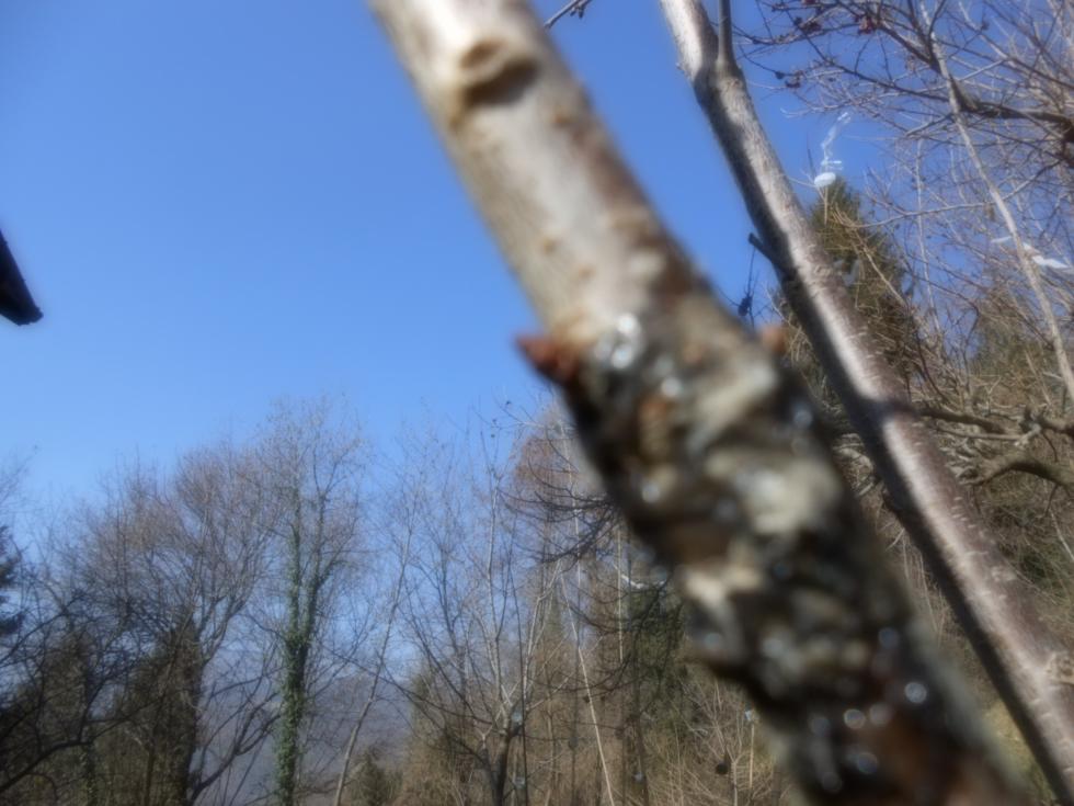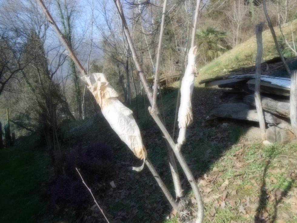 Ringrazio anche te Hyspanico. Per quanto riguarda la rimozione del "bendaggio" che in Sardegna faia fine gennaio, qui in Friuli, il mese successivo potrebbe essere consigliato. Comunque non ho chiesto prima quando togliere e poi mi sono dimenticato della gestione degli innesti fatti. Ieri li ho scoperti e allego le foto delle due gemme dormienti, di cui una terza, mostra una gemma originale che é più avanti.