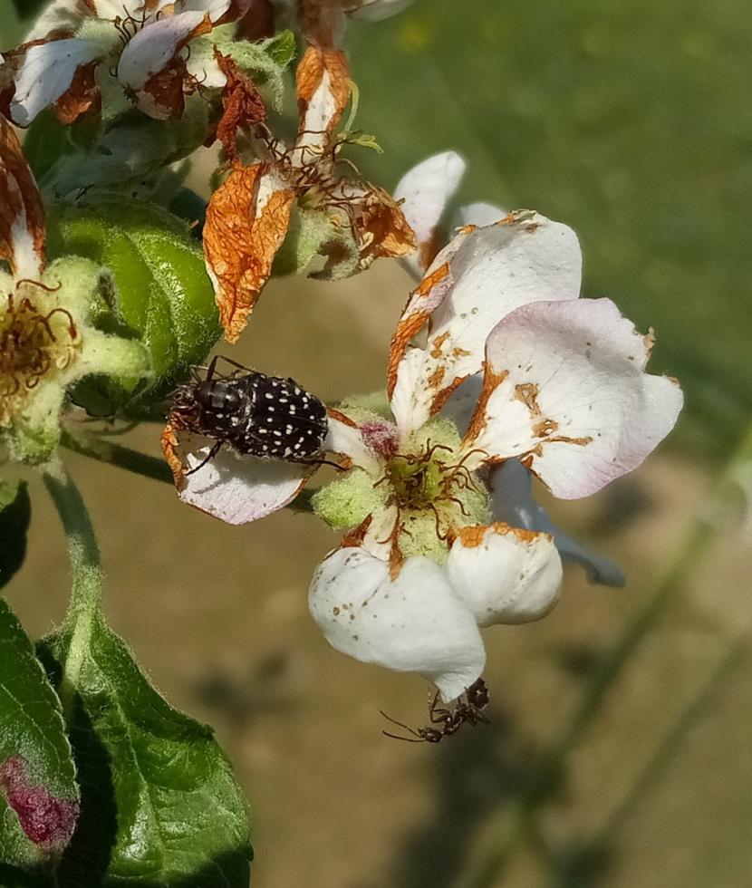 ho due peri e un melo, quest'anno i fiori sono stati attaccati dall'insetto che vedete in foto che li ha quasi distrutti tutti. Sembra un insetto molto goffo, se stuzzicato non vola (non so se sia in grado di farlo). Trovate qui un paio di foto fatte a tavolino per riprenderlo meglio. Qualcuno di voi sa di cosa si tratta? Grazie in anticipo!