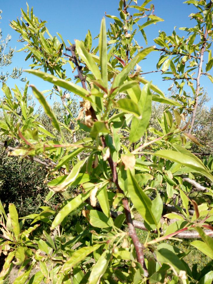 Ho notato che molte foglie del mandorlo si seccano all'estremità sui bordi. Non so se attribuirlo al vento o un attacco di peronospera. Chiedo un parere agli esperti. Grazie. Allego foto
