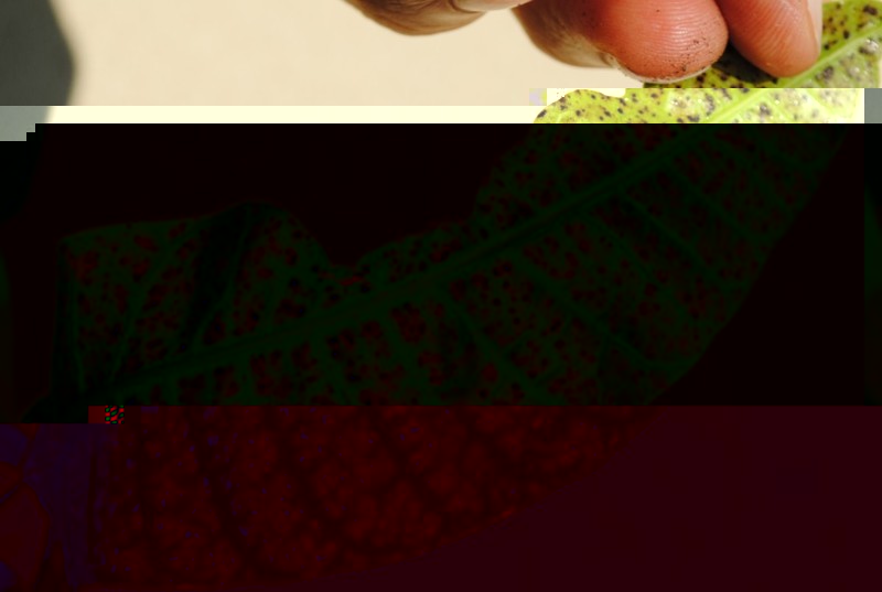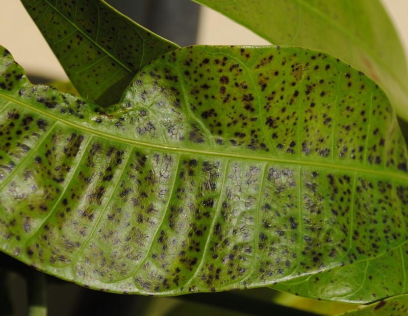 Da qualche giorno ho notato dei puntini scuri sulle foglie più giovani, sia sulla faccia superiore che inferiore (vedi foto). La faccia inferiore è anche diventata appiccicosa. Le foglie più vecchie e grandi non sembrano avere problemi, ma ho paura che vengano contagiate.