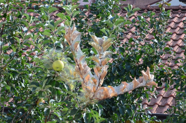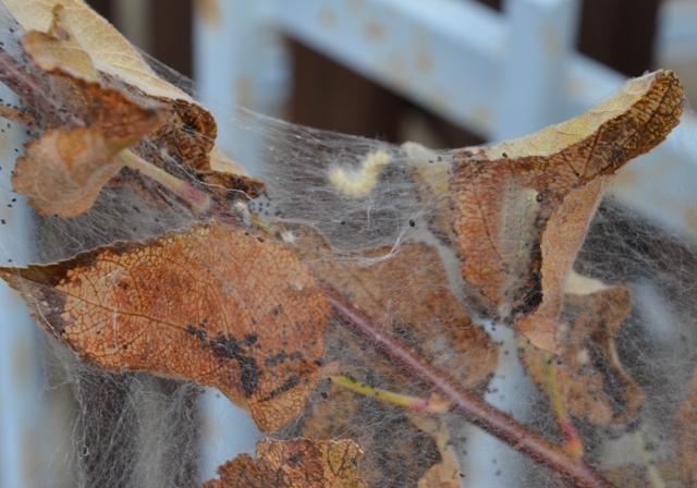 Sulla punta di un ramo si è sviluppata una ragnatela, al di sotto della quale le foglie sembrano seccate ma forse sono state "brucate" in superficie come testimonia la presenza di escrementi. Colpevoli dei bruchi pelosi della lunghezza di 15-20 mm, di cui oggi ne è presente una decina: Mai visti prima nè qui nè altrove: chi sono? Lepidotteri? Hanno importanza fitopatologica? Non ho notato crisalidi.