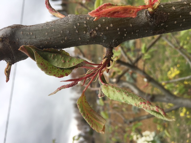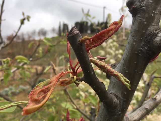 Fin da i primi germogli le foglie si presentavano rosse e puntinate, il problema è maggiore in corrispondenza delle potature (cacciata nuova vicino al taglio).