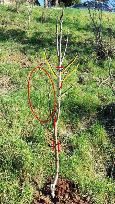 il prossimo anno dovrai fare la stessa cosa per ogni branca. lasciando 2 rami per branca Quindi taglio ora, prima della ripresa, secondo le linee rosse e lascio le branche lungo le linee gialle? Le branche più in alto mi sembrano troppo verticali e forse anche troppo alte... la mia paura è se poi, quando riprende la vegetazione, quelle branche che salvo non vegetano bene come spero... devo essere fiducioso e procedere? Magari ne lascio una in più e poi ne taglio una, quella che cresce peggio, il prossimo inverno? Grazie mille