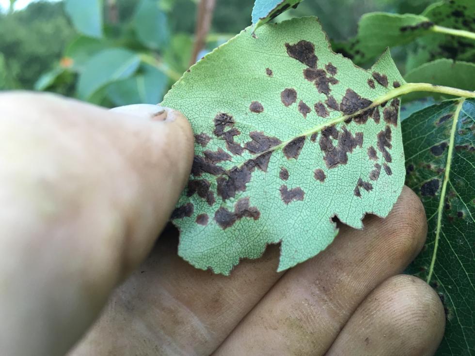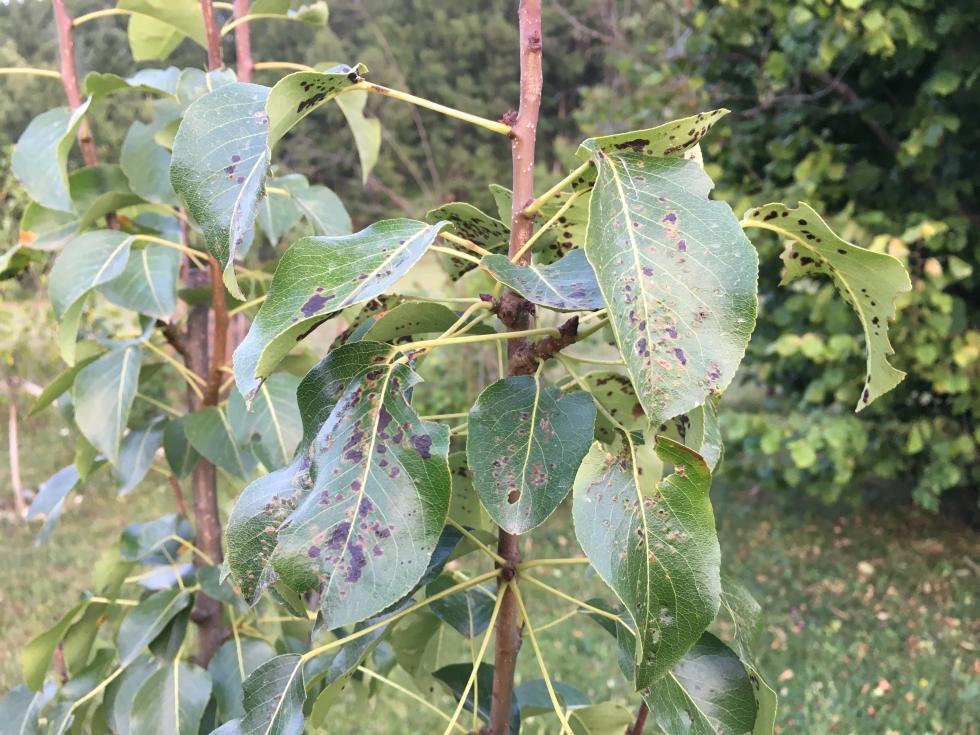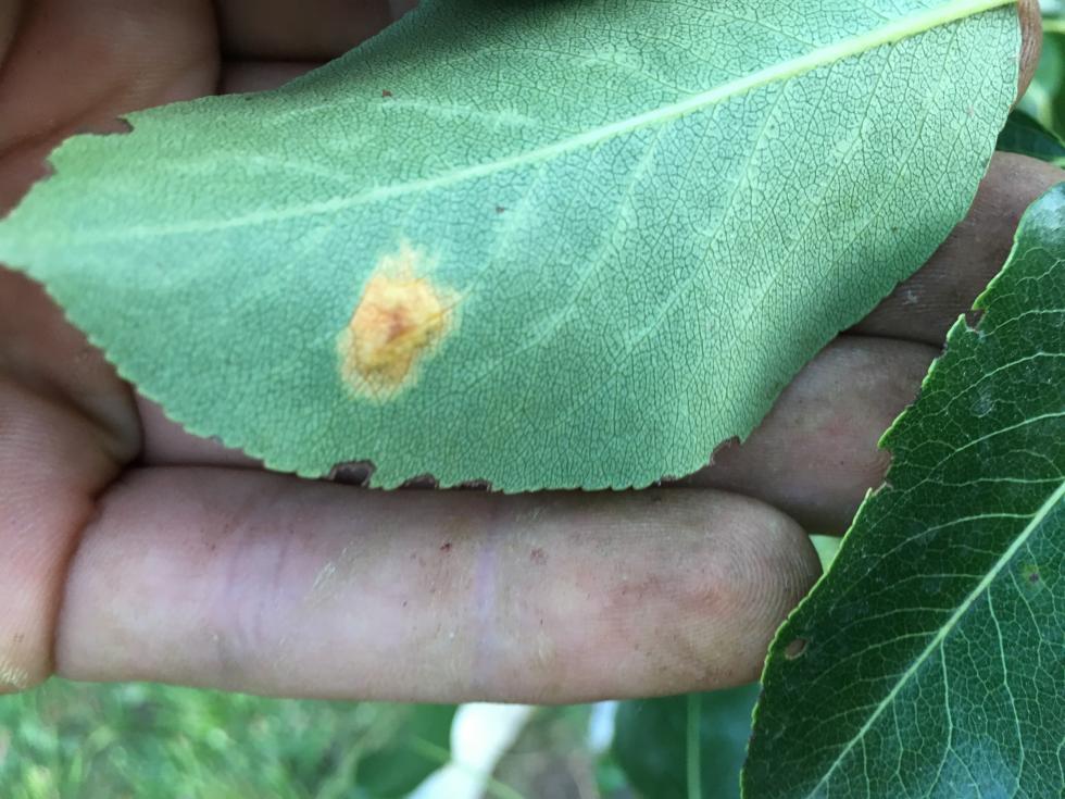 Pero giovane con ruggine e necrosi su foglie.