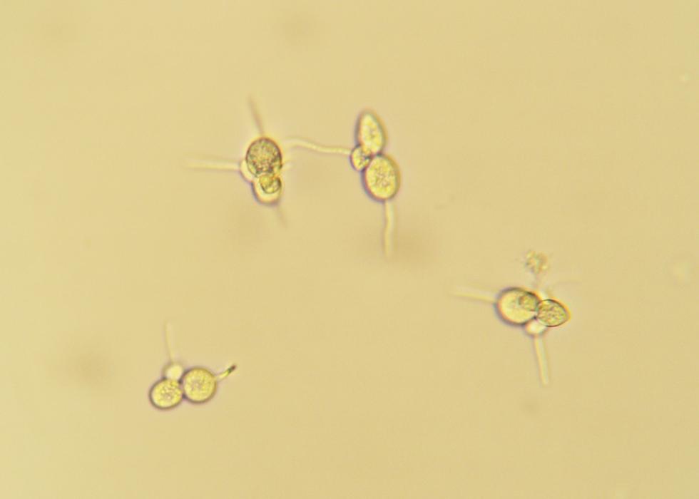 L'altra malattia è causata dallo stesso fungo che trovi in quel link sotto la denominazione di entomosporiosi della fotinia (va anche su altre piante come il cotogno e il nespolo) Microscopicamente è facile da determinare e non si può confondere con altri patogeni che causano macchie scure (es. maculatura bruna del pero) in quanto i propaguli asessuati hanno una aspetto molto caratteristico che ricorda quello di un insetto (da cui il nome di genere Entomosporium della forma conidica: ti allego una mia foto). Questo patogeno può infettare anche i frutti e in caso di infezioni gravi vi possono essere ripercussioni sulla formazione delle gemme a fiore per l'anno dopo: i trattamenti con fungicidi di contatto autorizzati su pero vanno fatti fin dall'inizio stagione in quanto il patogeno sverna sulla pianta, ma se la pressione di malattia è forte è bene intervenire anche in estate.