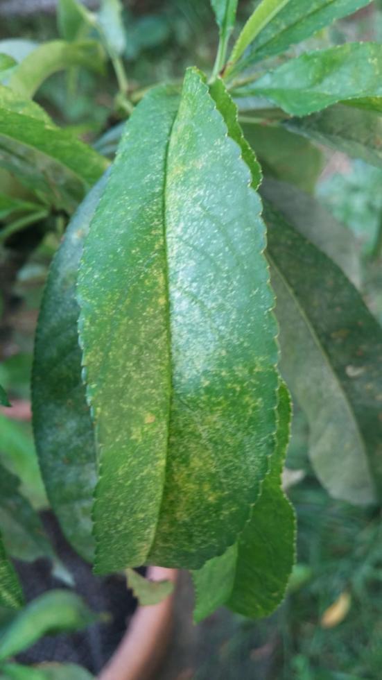 Salve, vi mostro la foto di una foglia del mio peso nano, ho dato poco fosforo e un po' di stallatico, sta in un vaso da 60cm. Potrebbe andar bene zolfo+rame?