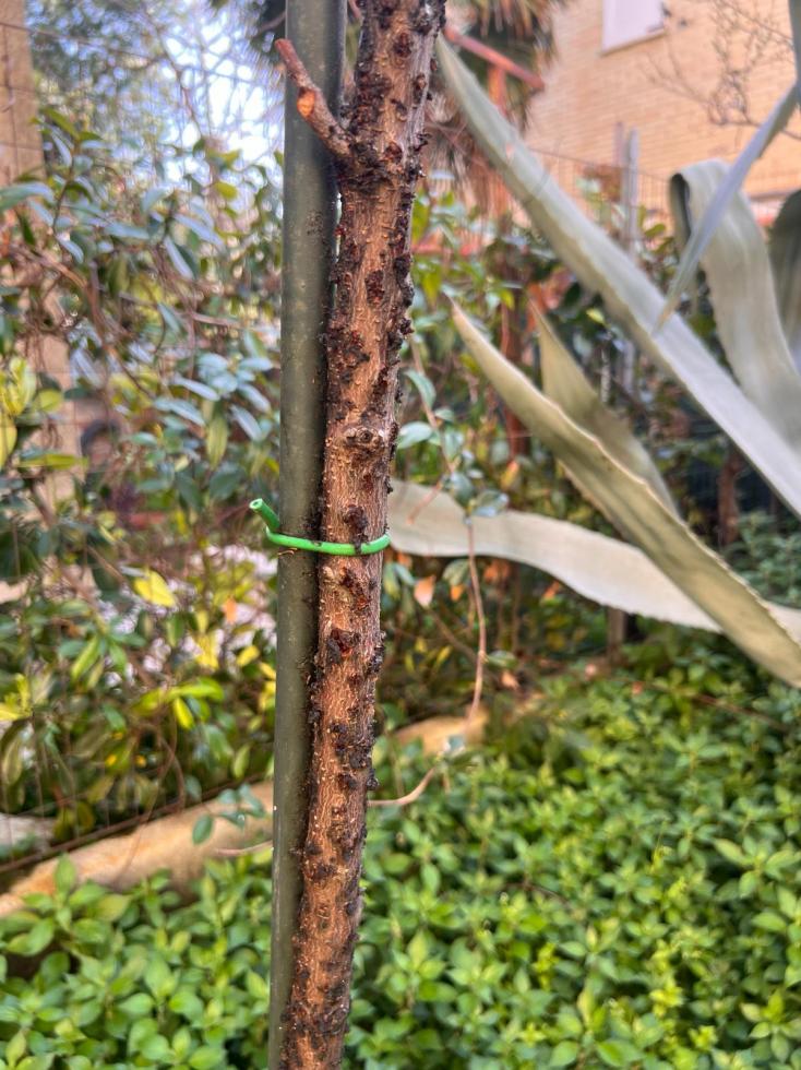 Cari amici del Forum, questa che vi allego in foto è la situazione del mio pesco a pasta bianca in vaso. Che cosa mi consigliate? Situazione ormai compromessa?