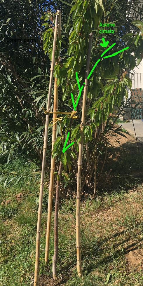 Per ora ho preferito non tagliare rami (quello in basso lo piegherò) in quanto spero che la pianta possa formare dei rami più bassi ed avere così le branche primarie a quell'altezza (110 cm) per evitare di avere poi i frutti su rami troppo alti.