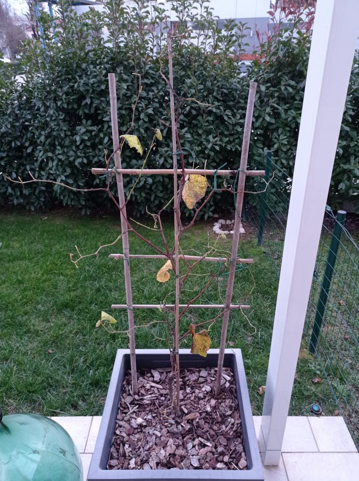 Buongiorno, cerco consigli su come potare la mia vite in vaso. E' una vite americana, uva fragola nera (vitis labrusca) e ha 2 anni. Allego alcune foto dello stato attuale, gennaio 2023, abito a Pordenone e la vite è esposta a Sud-Est. Grazie mille