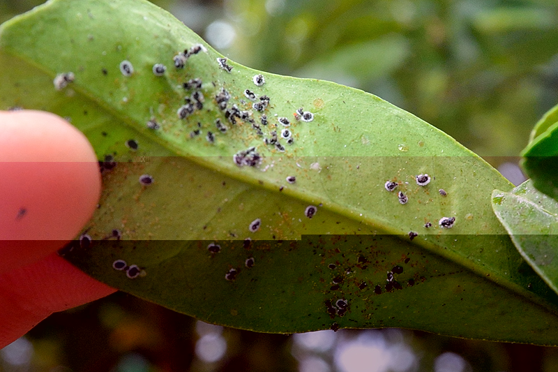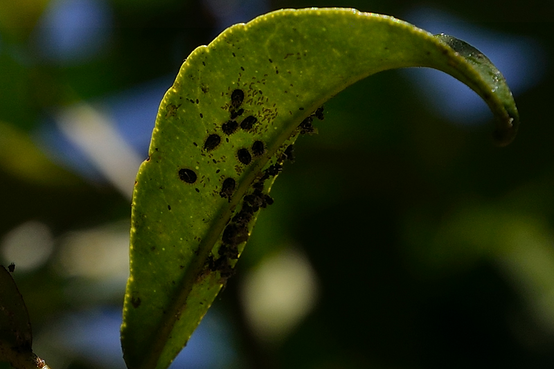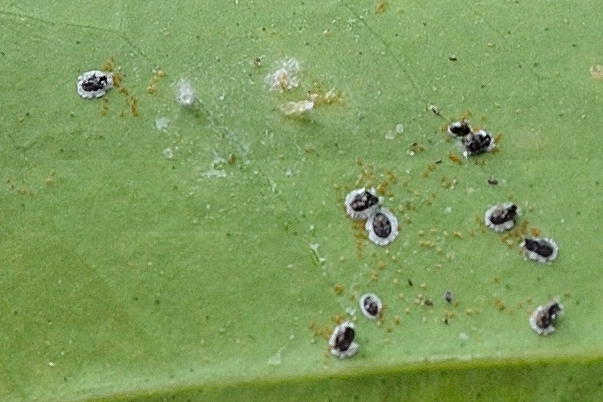 Sulle foglie degli alberi quest'anno è presente la minatrice serpentina e (credo) l'Aleuricantus Spiniferus discretamente diffuso sulla pagina inferiore delle foglie allo stato di neanidi e uova (non sono riuscito a vedere l'insetto adulto nonostante la lente).