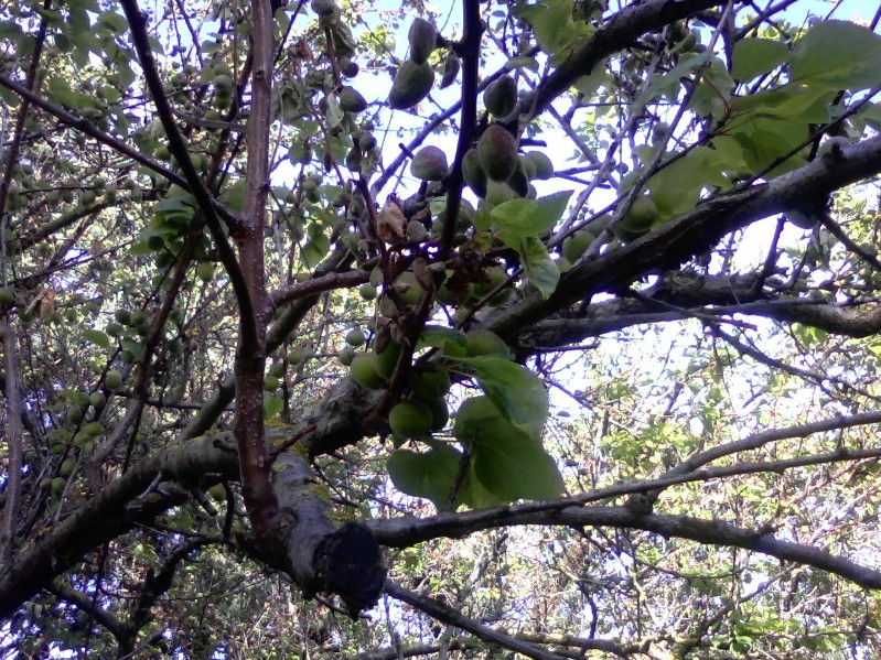 Scusate il ritardo: ecco 2 foto dell'albero che ha parti di rami con foglie appassite. L'albero ha davvero molti frutti ma poche foglie.