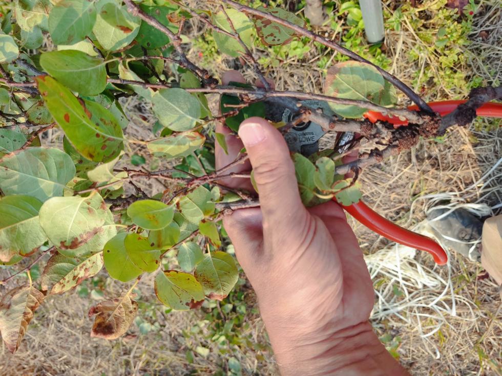 Diplocarpon mespili: la conferma si avrebbe se entro la macchia si scorgessero piccoli corpiccioli scuri (acervuli) che liberano le spore del patogeno che microscopicamente sono inconfondibili.